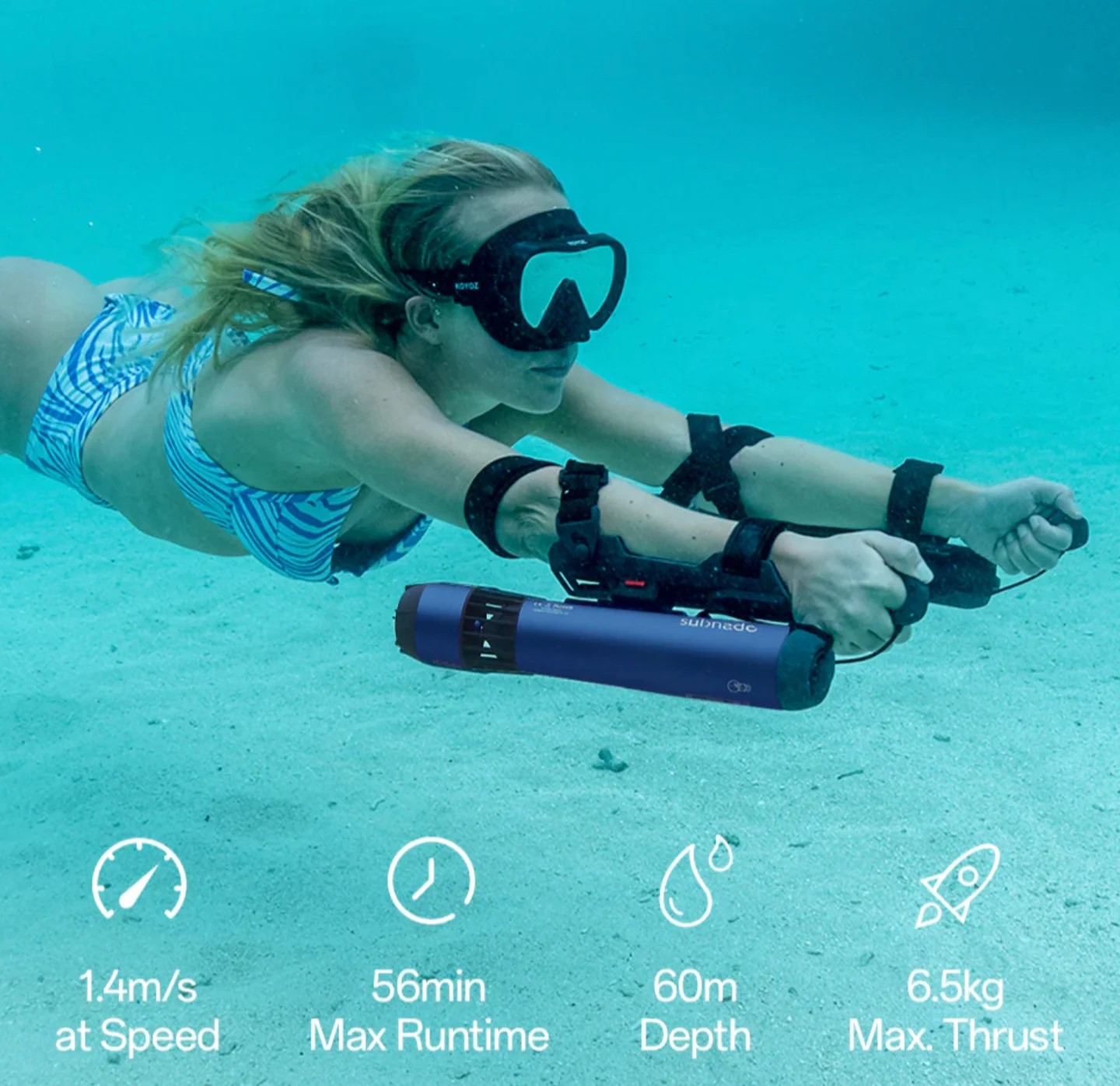 Only 38cm long & 6cm wide in size, the subnado has a compact, stylish, sleek design that is easy to carry, saving the limited luggage space for more travel supplies. Weighing only 1.4kg, it is 50% lighter than the regular underwater scooters. For traveling, lightweight means more burden-free. And its built-in 98-watt hour batteries are airlines approved, so they can fit perfectly in your carry-on luggage, traveling all the world without limits.